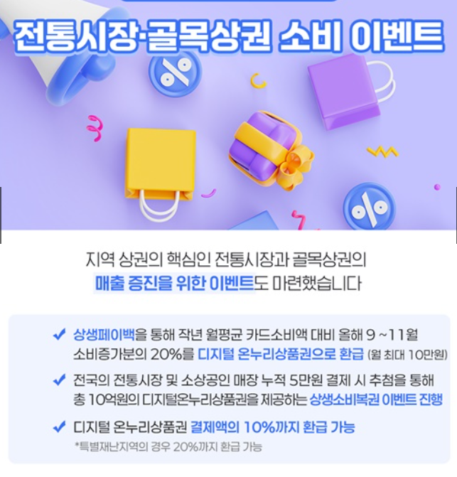 먼저 상생페이백 제도를 통해 작년 월평균 카드소비액 대비 올해 9~11월 소비 증가분의 20%를 디지털 온누리상품권으로 환급받을 수 있습니다.