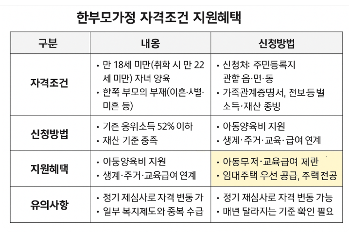 | 자격조건 | - 만 18세 미만(취학 시 만 22세 미만) 자녀 양육 - 한쪽 부모의 부재(이혼·사별·미혼 등) - 기준 중위소득 52% 이하 - 재산 기준 충족 |