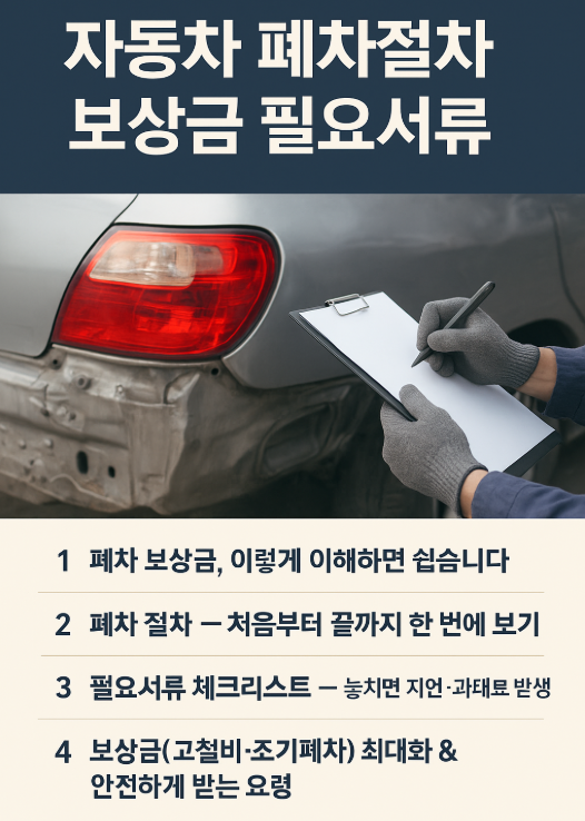 중고차 처분이 막막하셨나요? 폐차는 절차·보상금·서류만 정확히 알면 빠르고 안전하게 끝낼 수 있습니다.