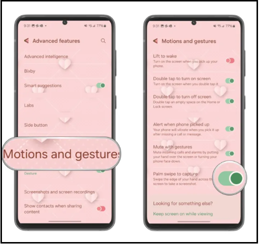 - 사용 방법: 화면 위를 손바닥 옆면으로 좌우로 스와이프하면 바로 캡처가 실행됩니다.