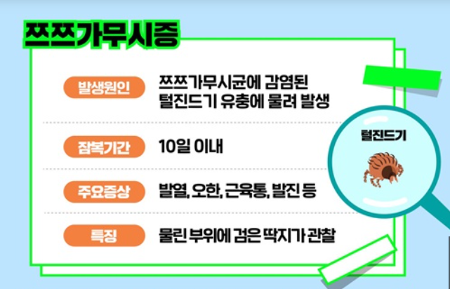 대표적으로 쯔쯔가무시증과 중증열성혈소판감소증후군(SFTS)이 있는데, 두 질환은 초기 증상이 감기와 비슷해 방치하기 쉽지만 심각한 합병증이나 사망으로 이어질 수 있어 각별한 주의가 필요합니다.