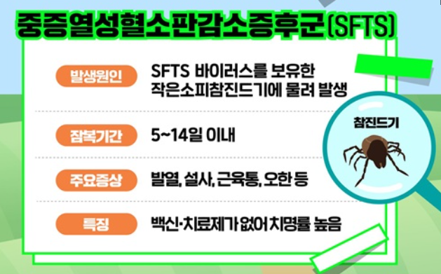 SFTS는 작은 소피참진드기에 의해 전파되는 바이러스성 감염병으로, 잠복기간은 약 5~14일입니다.