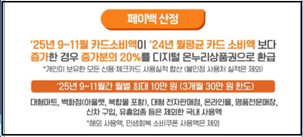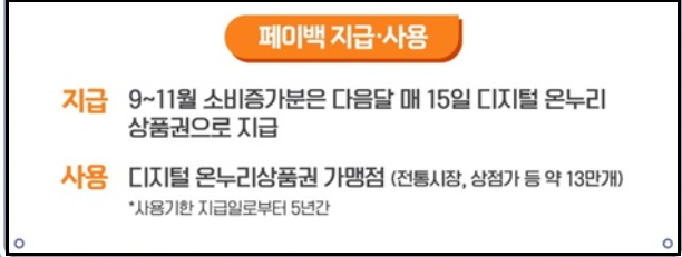 9월 소비 실적은 10월 15일에, 10월분은 11월 15일에, 11월분은 12월 중순에 디지털 온누리상품권으로 지급됩니다.