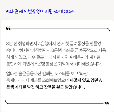 - 30대 직장인 사례: 첫 직장에 다닐 때 만들었던 급여통장을 이직과 결혼으로 잊고 있었지만, ‘파인’ 홈페이지에서 확인해 환급받았습니다.