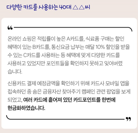 - 40대 소비자 사례: 쇼핑, 통신비 등 혜택별로 여러 카드를 사용하다 보니 포인트를 챙기지 못했지만, ‘숨은 금융자산 찾아주기 캠페인’을 통해 모아둔 포인트를 현금화했습니다.