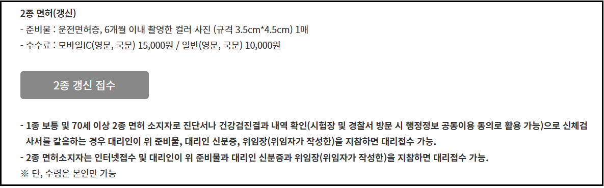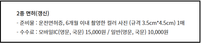 - 갱신 수수료는 면허 종류, IC카드 여부, 영문 표기 여부 등에 따라 다르게 부과됩니다.
