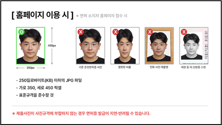 - 1종 면허는 사진 2매, 2종 면허는 1매가 일반적이니 사전에 확인 후 준비하는 것이 좋습니다.