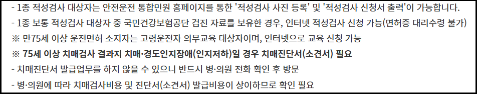 - 1종 보통 이상 면허나 일정 연령 이상 운전자의 경우, 병원에서 발급한 진단서가 요구될 수 있습니다.
