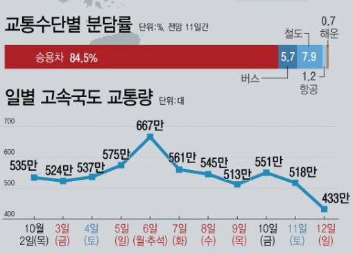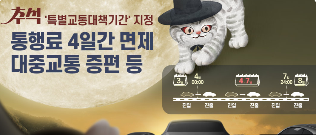 정부는 추석 전후 10월 2일 ~ 12일을 특별교통대책 기간으로 지정하고, 통행료 면제를 포함한 다양한 대책을 시행합니다.