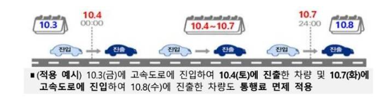 - 10월 4일 0시부터 7일 24시까지 나흘간 적용되며, 모든 차량이 대상입니다.