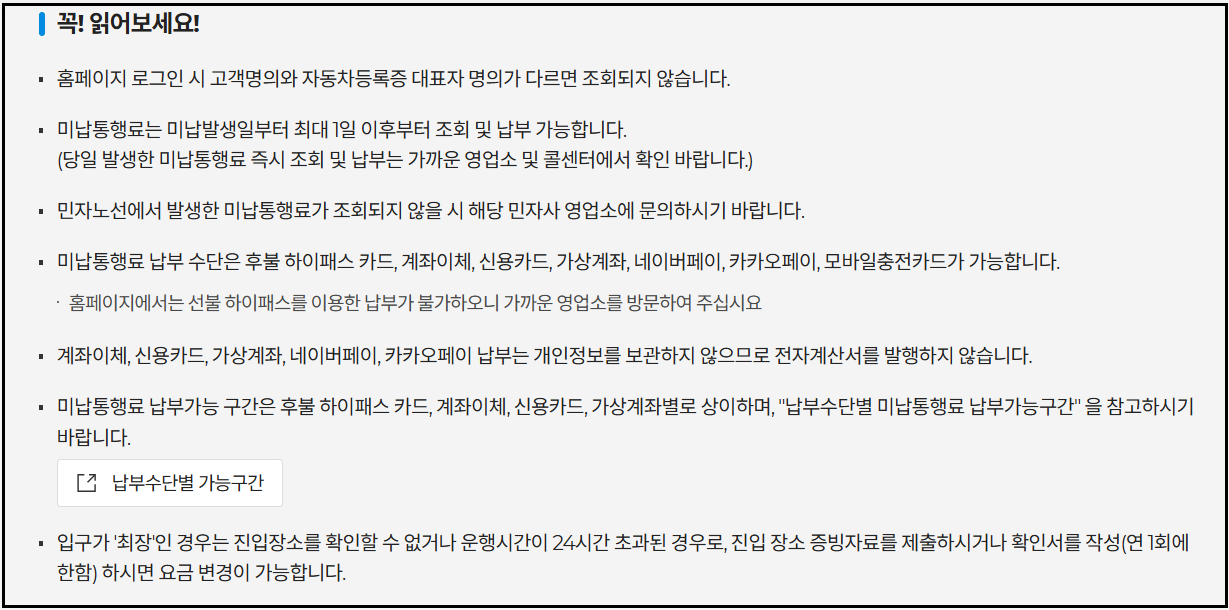단, 민자고속도로 구간의 미납요금은 각 운영사(서울-춘천, 서수원-평택 등)의 별도 홈페이지에서 납부해야 합니다.