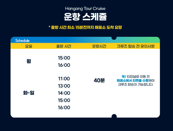한강 투어 크루즈 | 11:00 / 13:00 / 15:00 / 16:00 | 매일 운항 |