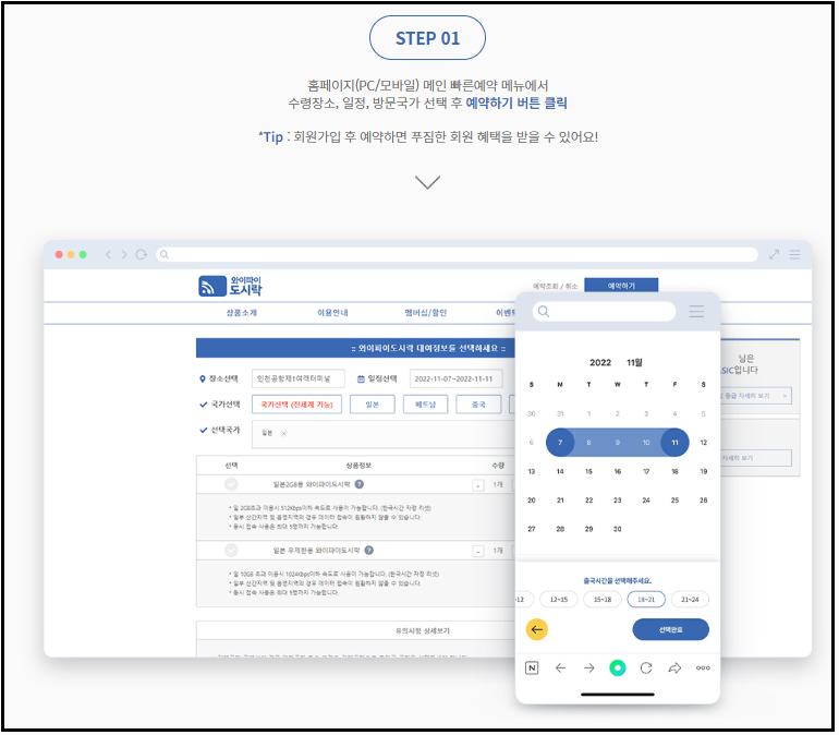 - 공식 홈페이지나 앱에서 여행 국가, 기간, 용량을 선택 후 예약