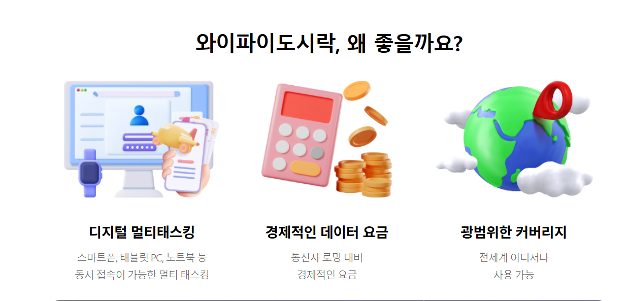 기기를 대여하거나 eSIM(이심)을 설치해 간편하게 사용할 수 있으며, 안정적이고 빠른 속도로 여행 중에도 끊김 없는 인터넷 환경을 제공합니다.
