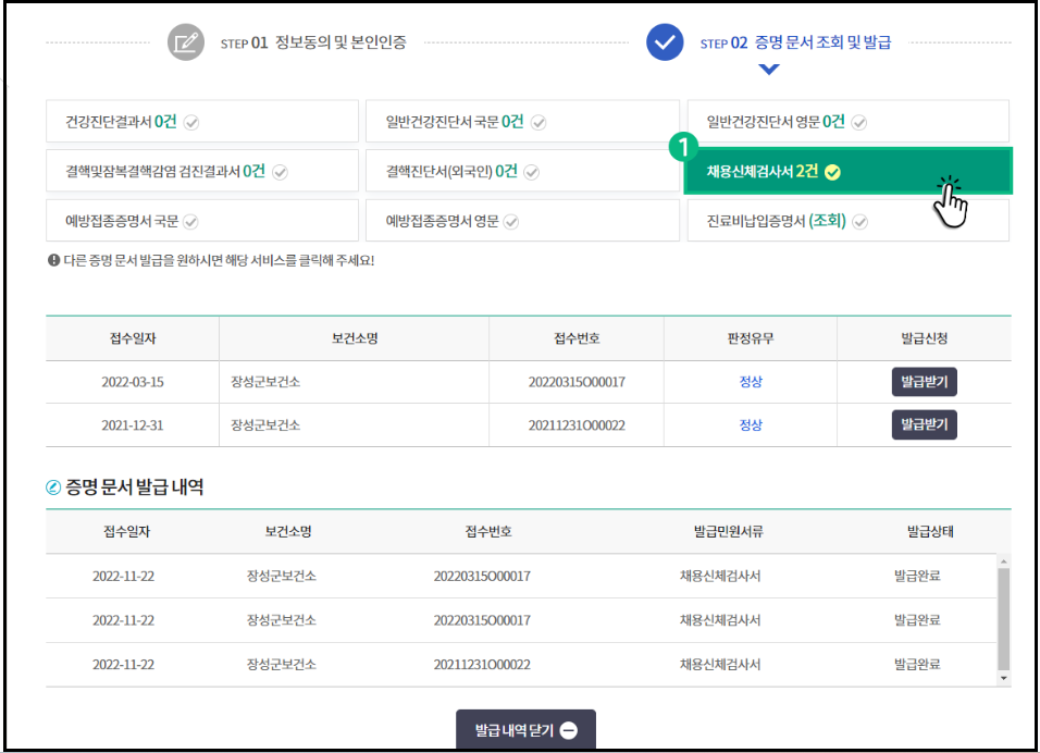 2. 상단 메뉴에서 ‘건강증명서 발급’ 클릭