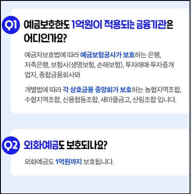 쉽게 말해, 내가 은행이나 저축은행, 보험사, 증권사 등에 예금을 맡겼다가 그 기관이 문을 닫더라도 일정 금액은 정부 차원에서 안전하게 보장받을 수 있다는 장치입니다.