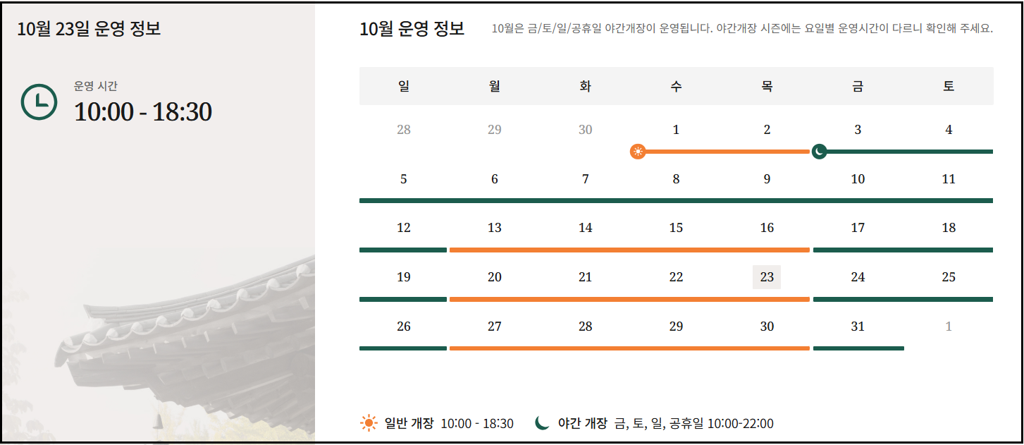 단, 야간개장은 계절과 행사 일정에 따라 운영 시간이 변동될 수 있으므로 방문 전 반드시 공식 홈페이지에서 일정을 확인하는 것이 좋습니다.
